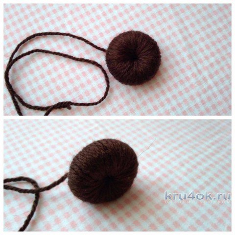 Вяжем пучок для балерины. Пучок — это, по сути, пончик, обмотанный нитью того же цвета, что и он сам. Вяжется как обычный шар, но без обоих полюсов. Когда полюса соединятся, получится приплюснутый шар, после набивки получится пончик:)