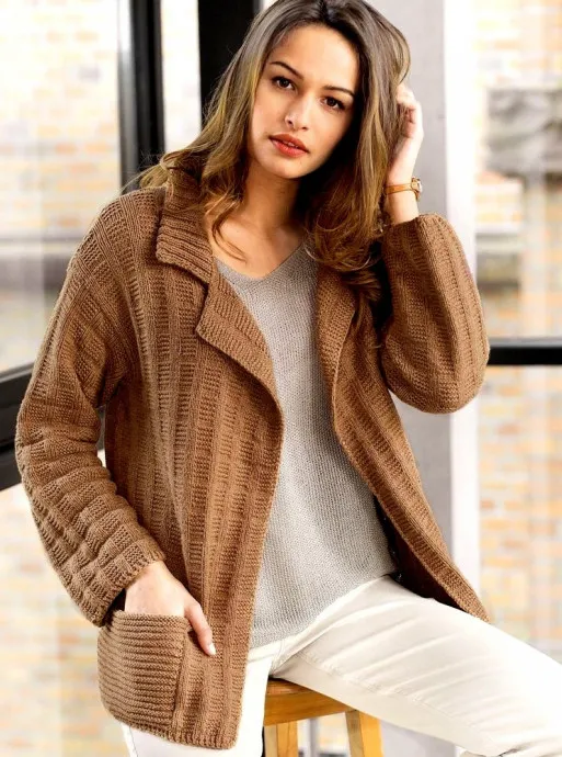 Пряжа (66% хлопка, 22% полиамида, 12% шерсти яка; 145 м/50 г) — 650 (700) 750 г светло-коричневой; спицы №4; длинные и короткие круговые спицы №4; крючок №3,5.