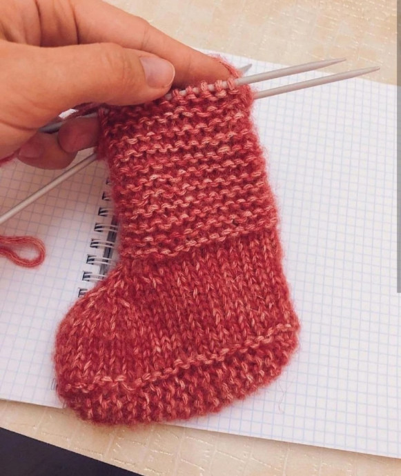 Теперь, из кромочных петель по краю стельки набираем на спицы петли как показано на фото в карусели: 8п(носик), 15п(боковая сторона), 8п( пятка), 15п(боковая сторона). Для удобства я вяжу на трёх спицах четвёртой. Распределяя петли по трём спицам так: на центральную спицу переснимаю по 3п с боковых( 14п получается), а с пятки на боковые по 4п( итого на боковых по 16п)всего 46п на спицах.