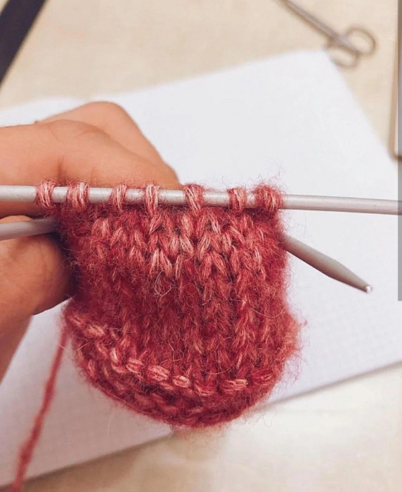 На спицы набираем 8 петель( 6п рабочие и 2п кромочные),вяжем 1-ый ряд лиц., 2-ой ряд изн.,в 3 ряду делаем прибавку: 1п кромочная снимаем, 1п лиц.,из протяжки делаем прибавку 1п(скрещенная лиц.),4п лиц.,прибавка из протяжки 1п(скрещенная лиц.), 1 п лиц.,1п кромочная(всегда изн). Итого на спицах 10 п. Далее вяжем шалевой вязкой ( чередуем 1р лиц., и 1р изн.) примерно 10 см, у меня это 32 ряда