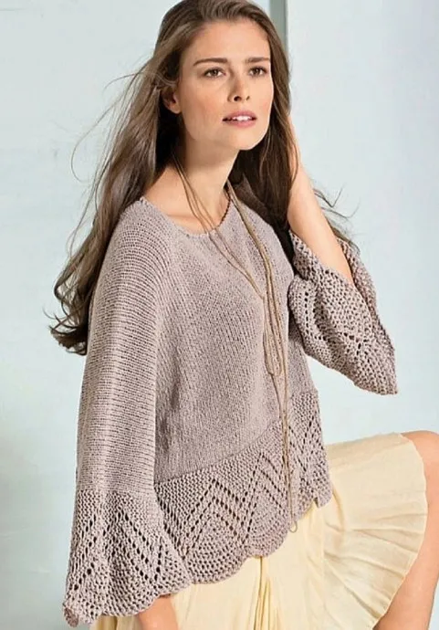 Внимание: джемпер вязать единым полотном без плечевых швов, начиная с переда. Бордюры вязать отдельно поперек. Плотность вязания бордюров относится к левому краю работы. По правому краю работу узор немного стягивается из-за платочной вязки