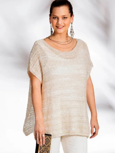 Металлизированная пряжа (31% полиамида, 25% полиэстера, 18% хлопка, 16% вискозы, 10% мохера; 100 м/50 г) – 400 (450) 500 (550) г белой; спицы № 5 и 9.