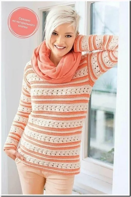 Классическая форма, полоски и фантазийные узоры - залог успеха этого комфортного пуловера. Оттенки абрикосового и белого смотрятся особенно гармонично и женственно.