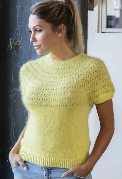 2 раз: 0 (2) 4 (6) 6 лиц.п., *1 п. из протяжки, 7 лиц.п., повторять от * по кругу = 128 (130) 132 (134) 134 п. на спицах.