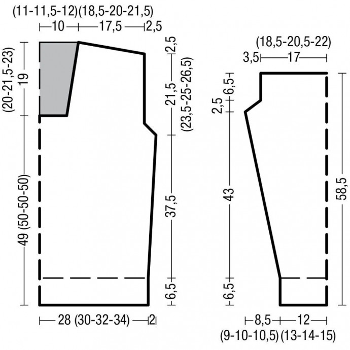 16 п. х 24 р. = 10 х 10 см, связано узором из полос. Образец выполнен на спицах №6.Выкройка - рис. 2