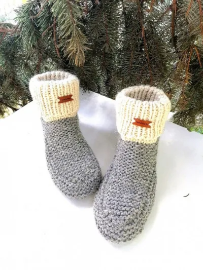 Эти сапожки связаны из шерстяной пряжи Деревенька, в 2 сложения. Для вязания я использовала прямые и чулочные спицы № 5.5.