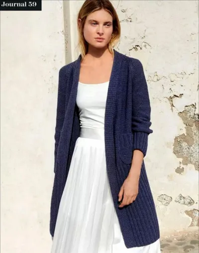 • 650 (700) г джинсовой (цв. 3) пряжи Fourseason (45% био-шер- сти (мериносовой шерсти extrafine), 40% био-хлопка, 15% рециклированного кашемира, 105 м/50 г) фирмы Lana Grossa; прямые спицы № 4,5 и № 5,5.