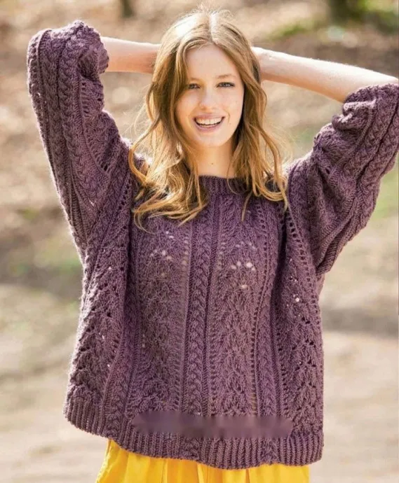 • пряжа (60 % шерсти. 40 % полиакрила; 90 м/50 г) — 500 (600) г баклажановой;