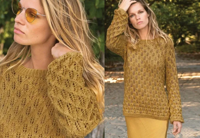 Основной узор джемпера представляет собой ажурные листья, которые придают изделию лёгкость и воздушность. Резинка на рукавах и нижней части изделия обеспечивает плотное прилегание и комфорт в носке.