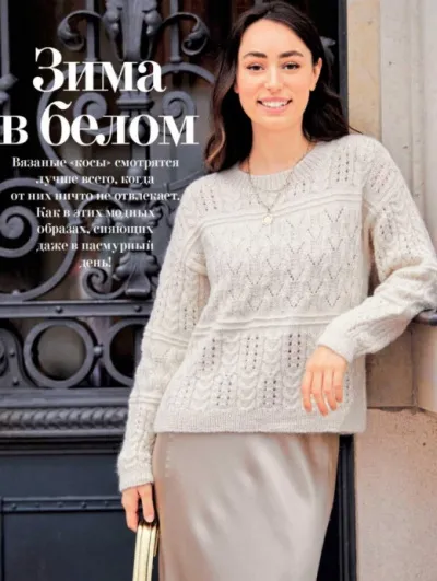 Пуловер связан спицами сочетанием узоров: «кос», ажура и поперечной резинки. Красоту вязаных структур подчеркивает мягкая пряжа, состоящая на 70% из экстратонкой шерсти альпака, которая обладает шелковистым блеском.