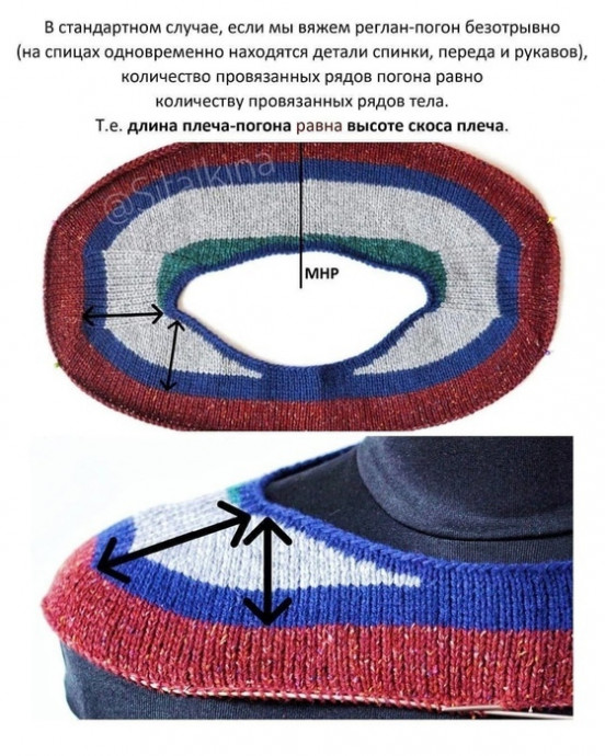 Я уже писала, что самая большая "проблема" посадки цельновязанного стандартного реглана-погон - это большой скос плеча. Сколько рядов вяжем погон, столько рядов вяжем и тело, выполняя прибавки вдоль погона. Т.е. в рядах длина погона равна скосу плеча. В сантиметрах всё зависит от пряжи и плотности, т.к. на спицах у нас трикотаж и в его силах и подсаживаться, и удлиняться.