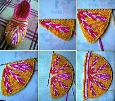 4.Снова вяжем с 1р по 12р . 2 раза. 4фото.5.Вяжем 5рядов платочной вязкой. Запускаем. По краю полукруга набрать петли ,и на средних связать подошву . 5фото.6.По бокам от подошвы набрать по 17п. И провязать на необходимую длину . Запустить пятку. Обвязать крючком. Тапочек готов