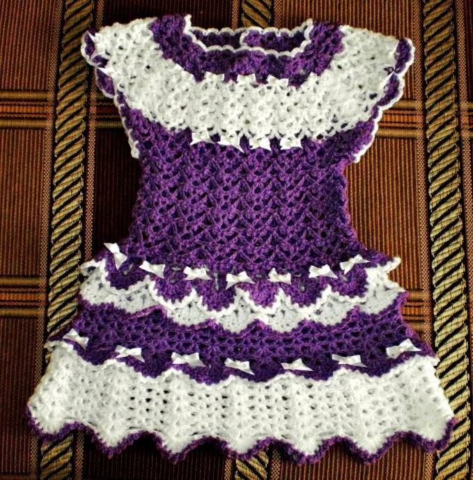 Из пряжи "Ареола" связала платьице, украсив его маленькими бантиками из белой атласной тесьмы с крохотными жемчужинками. Модель авторская.