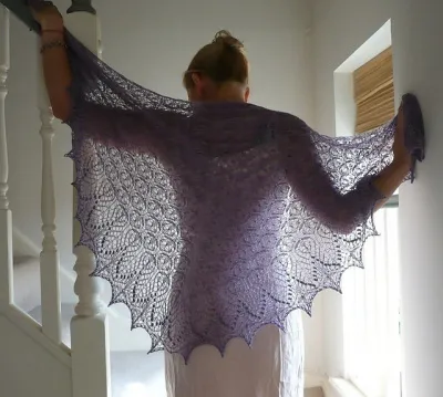 Спрячьте концы нитей. Опустите шаль в теплую воду на 30 мин. Отожмите и равномерно растяните шаль по форме треугольника, закалывая булавки в середину лепестков. Дайте изделию полностью высохнуть и снимите с булавок.