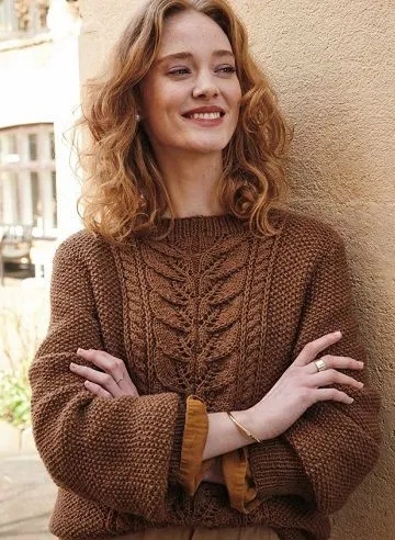 Панель с листьями, которая украшает женский свитер, напоминает теплую осень в коричневых тонах.