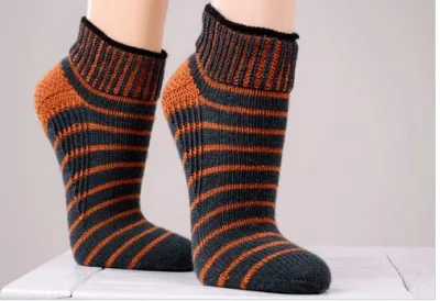 Связав пятку, работу продолжите круговыми рядами узором из полосок до длины стопы 22-23 см, после чего выполните мысок :