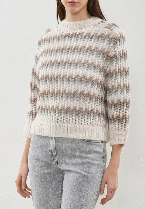 В этом джемпере красивая сетка, одновременно ажурная и рельефная. Петли 3, 7 и т.д. будут рельефными зигзагами. А дырочки сделаны на разном уровне - одни в лицевых, другие в изнаночных рядах.