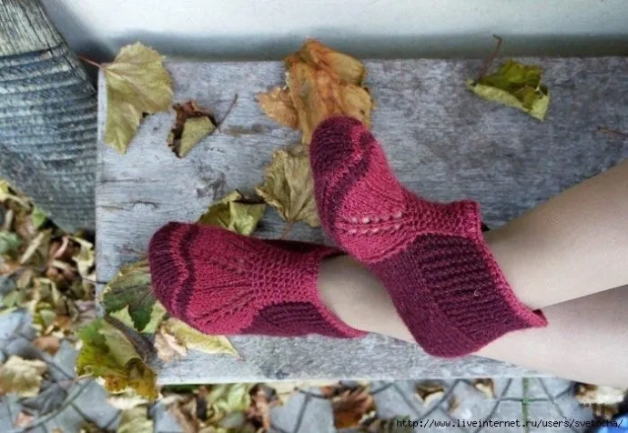 26 ряд:8 изн.,2 вместе изн.,повернуть вязание,фактически начинаем вязать подошву тапочка как пятку у носка.Так вяжем пока не убавим все петли. и на спицах останутся 9 петель.