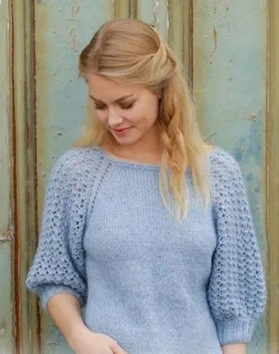 Набрать 82-86-90-94-98-102 п. нитью альпака + мохер, выполнить 4 круга платочным узором, далее продолжить: 12-13-14-15-16-17 лиц.п., накид, 2 лиц.п., А.1 (13 петель = рукав), 2 лиц.п., накид, 24-26-28-30-32-34 лиц.п., накид, 2 лиц.п., А.1 (13 петель = рукав), 2 лиц.п., накид, 12-13-14-15-16-17 лиц.п. В этом кругу прибавлено 8 п. = 90-94-98-102-106-110 п. Продолжить по схеме А.1 вязание рукавов и прибавления по 1 петле с каждой стороны от 2-х п. чулочной вязки – новые петли для рукавов вязать по схеме А.1. Накиды в след. кругу должны образовывать дырочки в полотне. Прибавлять по 8 п. в каждом 2-ом кругу всего 21-24-25-28-32-36 р. = 250-278-290-318-354-390 п. После того, как верт. раппорт по схеме А.1 будет выполнен, далее повторять раппорт А.Х (6 кругов).