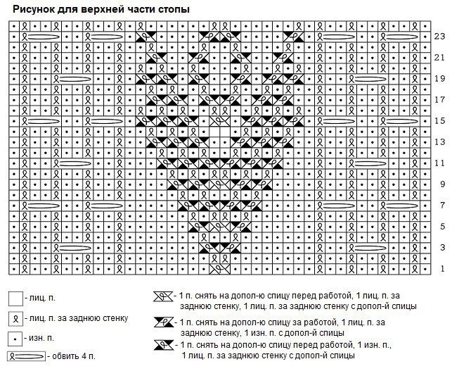 Повторить эти прибавления в следующих 7 рядах – на спицах 40 петель.Повторить эти прибавления в каждом 2-м ряду 10 раз – на спицах 80 петель: 20 петель подошвы на спице 1, 40 петель верхней части стопы на спице 2 и 20 петель подошвы на спице 3.Стопа:Провязывая петли подошвы лицевой гладью, вязать рисунок для верхней части стопы на 40 петлях на спице 2, пока ряды 1-24 раппорта рисунка не будут выполнены 3 раза, закончить в конце верхней части стопы (спица 2) в 24-м ряду рисунка, петли на спице 3 оставить непровязанными – всего связано 72 ряда рисунка, длина вязания составляет 20.5 см от наборного ряда.