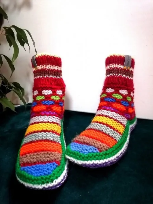 Расчеты подойдут для пряжи 200-250 метров /100 г, если нить тоньше- вяжу вдвое. Образец связан из остатков пряжи: Lanagold (Alize) 100г/240м., Народная (Пехорка) 100г/220м.,Baby wool XL 50г/100м., Ольга ПШ (Семеновская) 100г/392м., Детский каприз (Пехорка) 50г/ 225 м. При вывязывании подошвы добавила тонкую хлопковую нить.