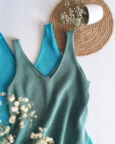 Продолжаем вязать так пока у пройм не будет по 9 убавок. Дадьше вяжем, НО УБАВКИ У ПРОЙМ НЕ ДЕЛАЕМ, а только у горловины, пока у каждой лямки не останется по 11 петель. В итоге по 9 убавок на пройме и 20 убавок на горловине для каждой лямки для размера 40, и по 9 убавок на проймах и по 24 убавки на горловине для каждой лямки для размера 44. После провязываем ещё 9(6) рядов без убавлений. Оставляем петли открытыми. Переходим вязать спинку аналогично. Открытые петли лямок сшивкам между собой невидимым швом с помощью иглы. Лямки тоже будут все равно скручиваться внутрь с боков. Но это даже плюс. Очень гармонично смотрится. Прячем хвостики и стираем.
