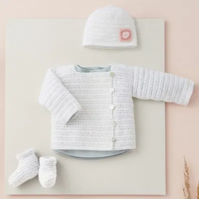 Пряжа P. Super Baby (70% акрила, 30% шерсти ягненка; 107 м/25 г) — 3 (4) 5 мотков белой (CYGNE); крючок №3; маркеры петель; 5 пуговиц диаметром 14 мм.