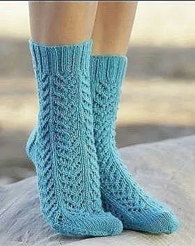 Эффектные ажурные носки спицами для женщин, выполненные из тонкой носочной пряжи на основе шерсти. Вязание носков осуществляется простым ажурным узором, напоминающим елочки. Схема узора приведена в описании. Описание носков спицами дано для нескольких размеров женских ножек.Схема 1Размеры35/37 - 38/40 - 41/43 см