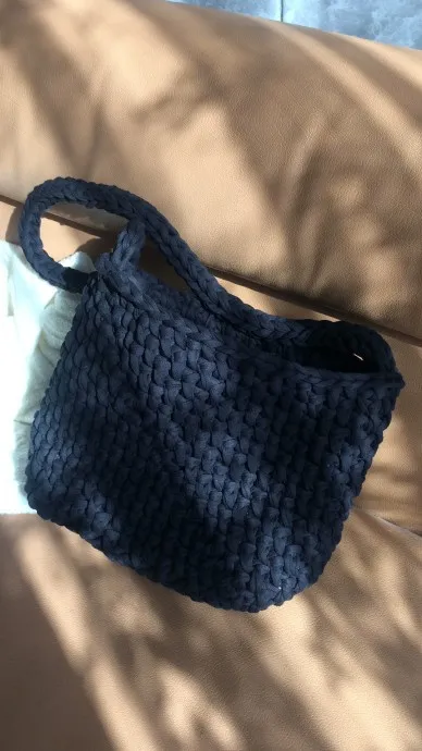 Связала сумку из трикотажной пряжи. Очень понравилось. Форму держит хорошо, осталось пришить молнию и будет все готово!