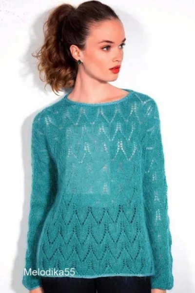 Вязаный женский пуловер выполнен спицами из мохера бирюзового цвета