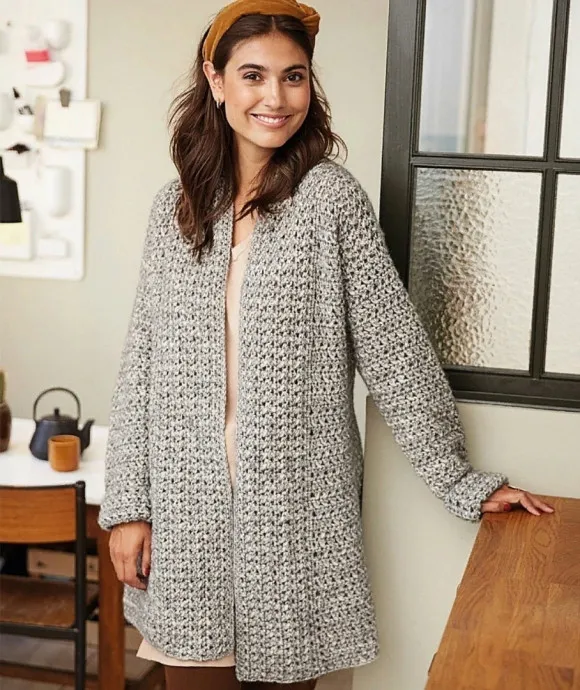 Структурный узор идет как в продольном, так и в поперечном направлениях. Полупальто идеально для межсезонья и заменит кардиган в холодное время года.