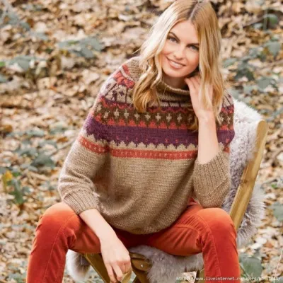 Пряжа (60% натуральной шерсти, 40% полиакрила; 90 м/50 г) — 600 (650) 700 г светло-коричневой, по 100 (150) 150 г кирпичной и лиловой, а также 50 (100) 100 г темно-коричневой; спицы №4,5; короткие и длинные круговые спицы №4,5.