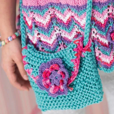 Простая и милая сумочка для девочки украшена связанным крючком цветком.