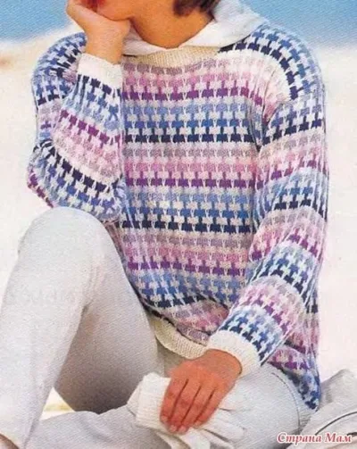 По вырезу горловины набрать на круговые спицы белой нитью 94 (94) 102 п. и связать 3 см резинкой. Затем все петли закрыть по рисунку. Втачать рукава, выполнить боковые швы и швы рукавов.
