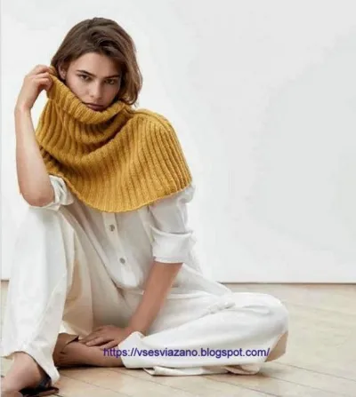 Оплечье-шарф-снуд вяжется сверху вниз по кругу. Стрелка на выкройке показывает направление вязания. Он вяжется с воротника - вниз!!!Набрать 140 (148) петли на круговые спицы размером 5,5 мм, длиной 40 см.