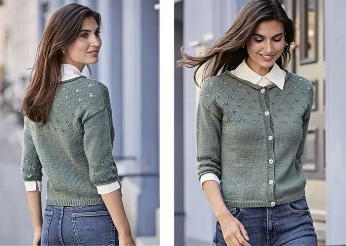 Пряжа Rico Essentials Merino dk (100% шерсти; 50 г/120 м) — 8 (9) 11 (12) мотков серо-зеленой; прямые спицы № 3,5 и 4; маркеры петель; 6 пуговиц диаметром 17 мм.