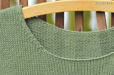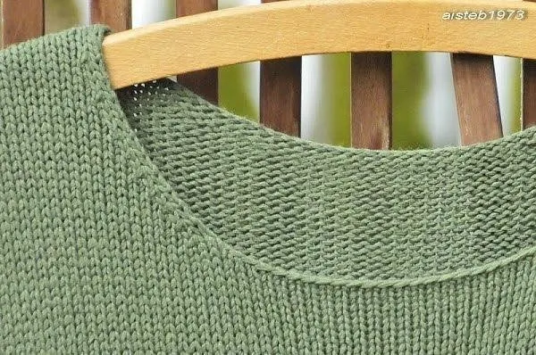 Было бы все хорошо, если бы на левой стороне начала формирования горловины не образовывалась бы впадина между косичкой прямо закрытых петель, присоединения нового моточка и далее идущих убавок. Эта впадина образовывается между в разные стороны наклонившихся петель (имеется ввиду горловина незастегиваемых изделий), и даже под планкой иногда бывает трудно ее спрятать, особенно, если вяжем толстыми, скользкими нитками, или планка пришивается методом кетлевки. Дальше я расскажу, что надо делать. Всем знакомая ситуация:1. Поднимаем стрелкой указанную петлю на правую спицу, поварачиваем работу и прятаем ее скрещивая со следующей петлей (меняем местами). Связываем их вместе изнаночной и провязываем изнаночный ряд до конца. Дальше вяжем по другой стороне схемы проймы, выставленной выше.2. Получаем вот такой результат, и этого достаточно, чтобы дальше набирать петли для планки (воротника) или пришивать (прикетлевать) их. Впадина закрыта. Этот метод я использую уже давно для всех горловин незастегиваемых изделий.3. Но для необработанного края такой результат никого неудовлетворит и надо обрабатывать дальше. Берем крючок и протягиваем кончик нитки, который остался от присоединения нового моточка, через первую петлю косички закрытых петель. Потом протягиваем нитку еще раз с другой стороны через чуть видимую петлю сзади (указана стрелкой). Так мы сформировали недостающую петлю косички, соединяющую косичку закрытых петель и кромочные изогнутого края. Кончик нитки вплетаем.
