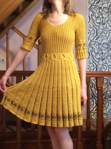 Наталья, спасибо. Цвет нам тоже очень нравится. А фасон рождался по мере роста изделия. Как-то сам собой. Хочу заметить, платье без швов. Только рукава сшивались, потому что не очень удобно было вязать жаккард на круговых