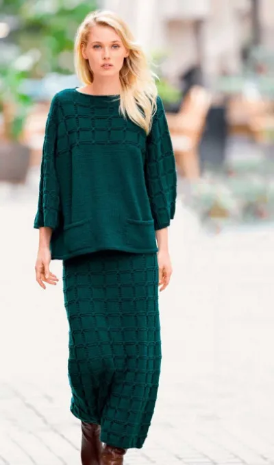 Плотность вязания: 20 п. х 30 р. = 10 х 10 см, связано рельефным клетчатым узором спицами № 4.