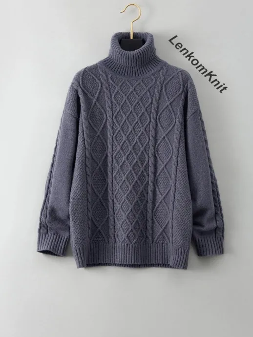 Модель № 1 - еще один темно-серый свитер с воротником-гольф. В этой модели два вида ромбов - маленькие в виде решетки в центре и крупные по бокам. Их разделяют жгуты.