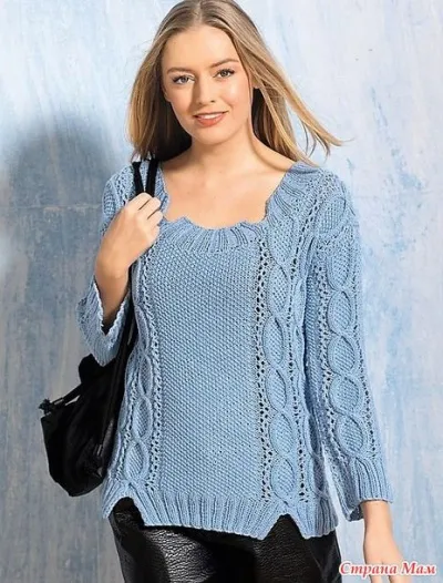 Раздельные планки придают этому пуловеру экстравагантность и легкую небрежность. Комбинация жемчужного узора и ажурных «кос» тоже смотрится интересно.
