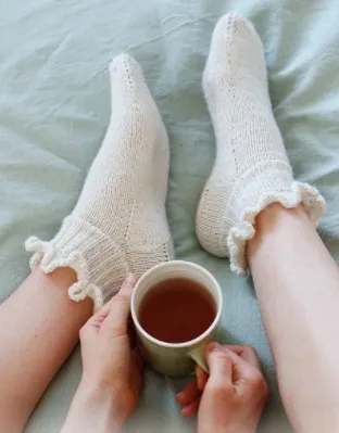 Продолжить вязание лицевой гладью и В ЭТО ЖЕ ВРЕМЯ делать убавки для формирования мыска с каждой стороны от обоих маркеров так:Перед маркером: вязать 2 петли вместе лицевой с наклоном вправо.После маркера: вязать 2 петли вместе лицевой с наклоном влево.Повторять убавки с каждой стороны в каждом 2-м ряду в общем 4-7-9 раз и затем в каждом ряду 6-3-2 раза = 12-16-16 петель останется на спицах.В следующем ряду провязать все петли по 2 вместе лицевой = 6-8-8 петель.Обрезать нить и протянуть ее через оставшиеся петли, стянуть и заправить кончик нити.Второй носок связать также.