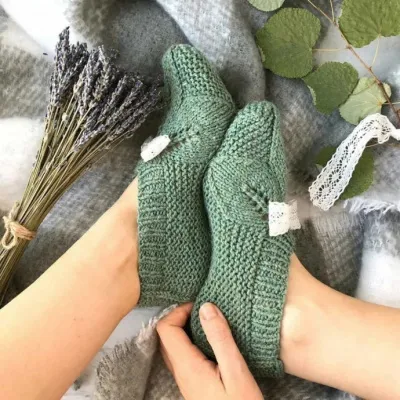 Продолжаем вязать подошву вверх,подцепляем кромочные петли по боковинкам(всего 18 раз) и провязываем по 2 петли вместе в конце ряда.Можно закончить пятку резинкой.Закрываем петли.Стираем,отпариваем только листики.Можно украсить пуговками,стразами,вышить контур цветной ниткой,продёрнуть шнур под резинкой.Из старой футболки вырезаем стельку по контуру ступни,пришиваем внутрь следочка. Так мы проносим их дольше.