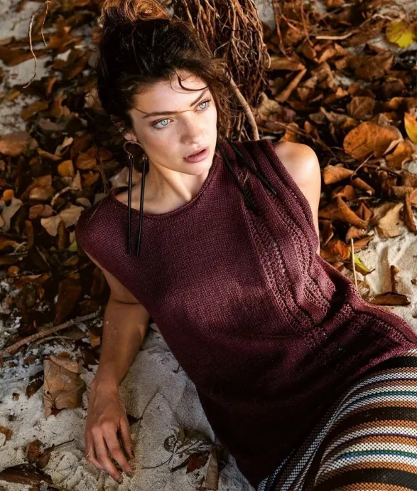 В этом топе проходящие сбоку полоски сквозного узора заложены в складки на высоте плеча — эффект просто потрясающий, в том числе благодаря пластичной пряже из смеси льна и шерсти.