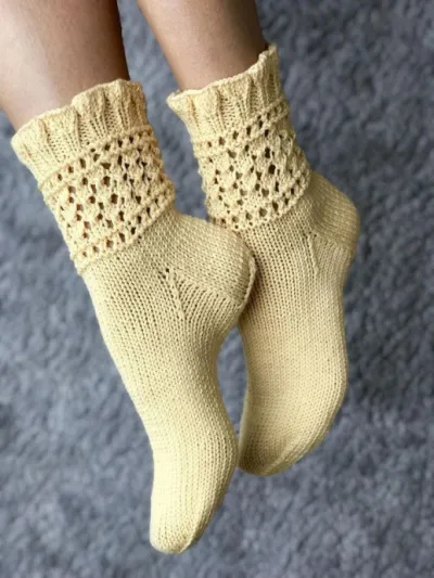Вязать по кругу на чулочных спицах сверху. С оборочки, которая делает носочки такими фантазийными.