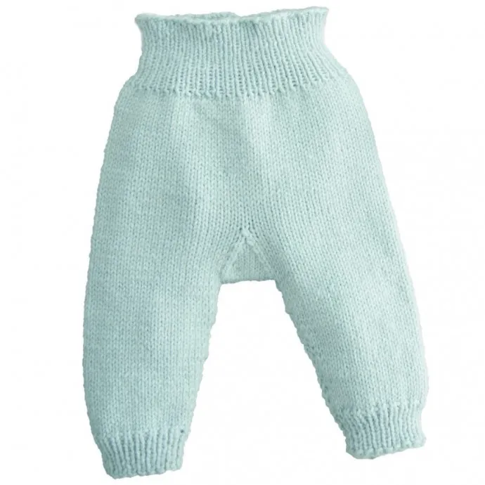 Затем перевести все петли на круговые спицы № 3,5 и между штанинами набрать по 8 п. для ластовицы.