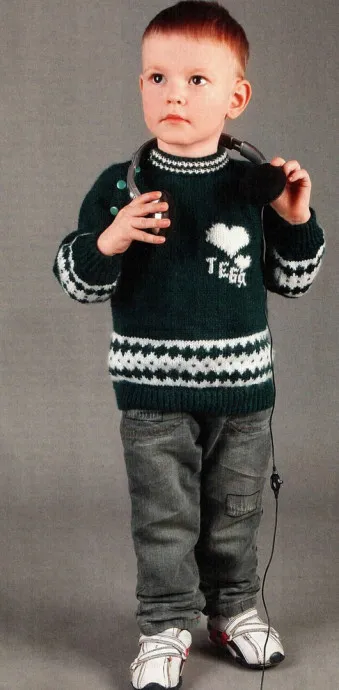 Сборка и завершение работы: сшить оба рукава с изнаночной стороны и вывернуть их на лицевую. Затем сшить боковые швы, и выполнить плечевой шов с одной стороны, вшив оба рукава. Набрав по кругу горловины 84 петли, выполнить резинку ( 1 ряд пряжей зеленого цвета, затем 2 ряда пряжей белого цвета, 2 ряда пряжей зеленого цвета, 2 ряда пряжей белого цвета и 8 рядов пряжей зеленого цвета), закрыть все петли. Начать выполнение боковой планочки застежки, набрав необходимое количество петелек пряжей зеленого цвета, связать 4 ряда резинки пряжей зеленого цвета. Во втором ряду выполнить петельки для пуговиц, равномерно распределив необходимое количество. Петельки выполнять следующим образом: провязать 2 петли вместе, в следующем ряду набрать закрытую петлю. Подвернуть воротник, пришить его с изнаночной стороны, пришить пуговицы. Петлю на воротнике выполнить с помощью иглы.