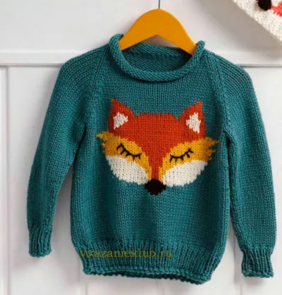 Перед: вязать, как спинку, но при этом в технике интарсий выполнить по схеме мотив «Лисичка», начав его вывязывать через 16(18-20) р. от резинки. Через 31(33-35) см = 72(76-80) р. от резинки средние 10(12-12)п. для горловины временно оставить и обе стороны закончить раздельно. Для закругления горловины закрыть с внутреннего края в каждом 2-м р. 3 раза по 1 п. На высоте 40(42-44) см от нижнего края детали оставшиеся 2 п. временно оставить. Вторую половину закончить в зеркальном отображении.