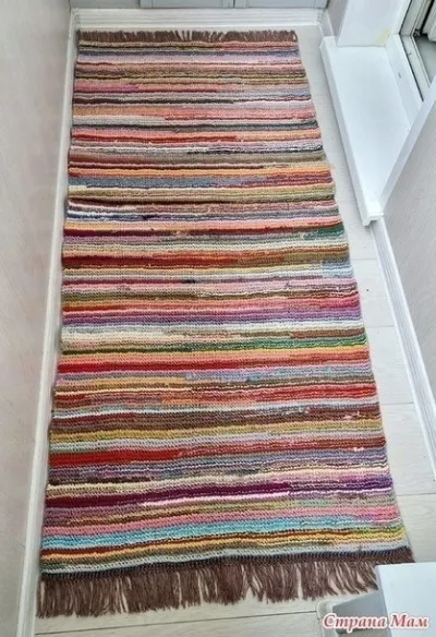 Обвязка узких сторон коврика столбиками с накидом с обеих сторон коврика, затем соединение соединительными столбиками за ближние друг к другу полупетли. Бахрома в каждый столбик с накидом