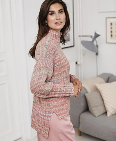 Мелкий рельефный основной узор прекрасно гармонирует с плавными переходами оттенков пряжи, а удлиненная спинка вносит в эту модель нотку неформальности.